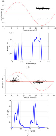 PDs are commonly represented superimposed with an AC cycle of the voltage reference. This representation is known as a phase-resolved PD (PRPD) pattern due to the fact that each kind of PD source follows a typical form. In this way, internal PD has a cluster spanning from zero crossings, 0° or 180°, of the AC signal whose pulses have different peak amplitudes. In a surface PD, the PRPD pattern accumulates around the maximum and minimum of the AC voltage; signals also have different peak amplitudes depending on the semi-cycle. Finally, corona PDs commonly have PDs around 90° and 270°, with all the pulses having similar peak amplitudes.