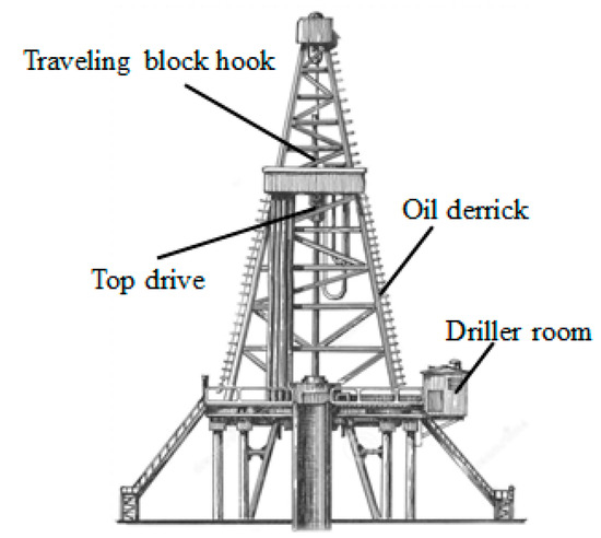 A drilling rig hoisting platform is an indispensable piece of equipment in oil exploration. The entire platform mainly includes a top drive, a traveling block hook, an oil derrick, and a driller room [1], as shown in Figure 1. The top drive rotates the drilling tool and circulates the mud, shackle, and pick up pipe [2]. The oil derrick lays the crown block, suspends the traveling block hook and top drive, and stores the drill pipe [3]. The driller room, which has various electrical, mechanical, and communication technologies as an organic whole, provides a comfortable working environment for the driller [4]. The rig hoisting platform is a cornerstone in a drilling operation. It is particularly important to ensure safety because the complexity of the actual working condition and working environment is prone to accidents. Addressing the potential safety hazard in the process of drilling and properly documenting casualties and economic losses caused by accidents are urgently needed. So establishing the rig hoisting platform’s security monitoring system is necessary.
