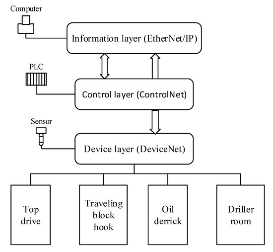 The rig hoisting platform monitoring system comprises three parts: the upper machine, the controller programmable logic controller PLC, and the device layer. The network diagram of the entire system is shown in Figure 2.