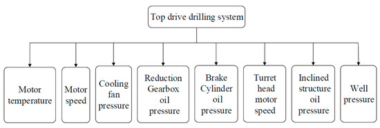 With the development of drilling technology, the top drive drilling system gradually replaced the rotary drilling rig [16]. In the process of drilling, the top drive drilling systems provides the drilling motive, circulates drilling fluids, and reduces the number of connecting single pipes. It plays an important role in the entire process of drilling. Real-time mastery of the working conditions of the top drive drilling system is necessary. The top drive drilling system mainly consists of a top-drilling motor assemble, motor bracket/guide block assemble, make-up or break-out device of the drill pipe assemble, and other auxiliary systems.