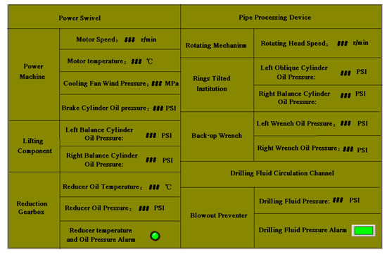 Figure 6 presents all the top drive monitoring parameters. The top drive is divided into several important components. Each component of the monitoring parameters is detailed in the annotation. The driller can be intuitive and detect the working situation of each part.