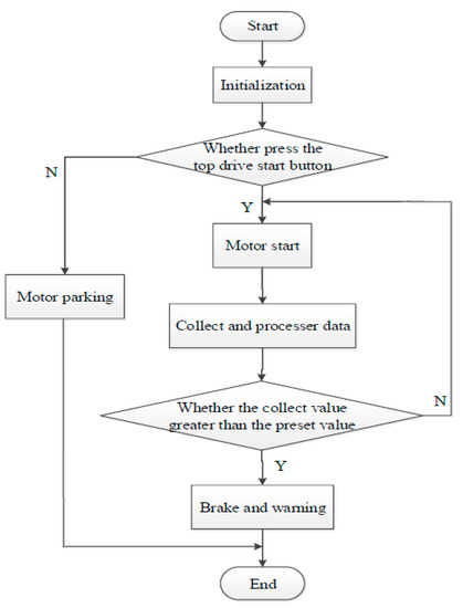 The designing of the top drive system program goes as follows: The programmable logic controller PLC is powered on, and the module is initialized. Whether or not to push the drive start button is determined. When the top drive is launched, the motor temperature, motor speed, and wind pressure of cooling fan are collected and processed in real time to determine if the temperature is over 135 °C and the wind pressure id less than 1 MPa. If the values are greater than the preset temperature and wind pressure, the motor will send out an alarm and brake. The program flow chart is illustrated in Figure 9.