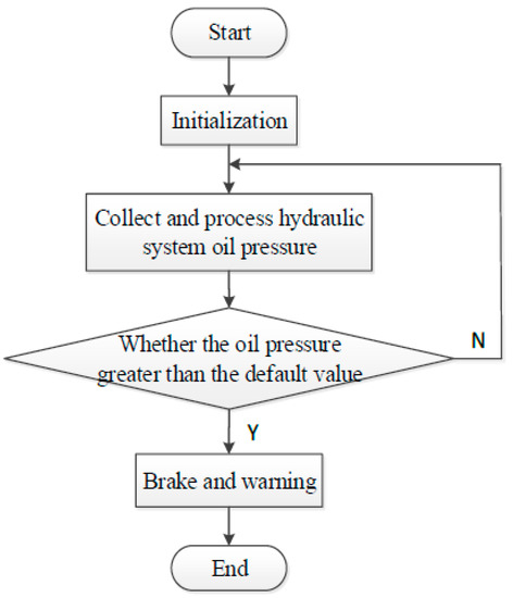 The other acquisition modules are the real-time monitoring of the reduction of gearbox oil pressure, brake cylinder oil pressure, and inclined structure oil pressure. According to top drive hydraulic design manual, rated pressure of hydraulic system is 16 MPa. If this oil pressure exceeds more than the system rating pressure 16 MPa, the system will send out an alarm and set off the emergency brake. The program flow chart is presented in Figure 10.
