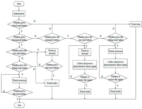 The traveling block hook is present in the derrick, and it controls the traveling block hook in the control winch. In this system, photosensitive sensors are used to determine if the hook arrives at the specified location. The module is initialized, determine if the winch start button should be pressed, determine if the automatic button or the manual button should be pressed, and find out if the hook is rising or falling. The hook stops at the specified working location when the automatic button is pressed and when the hook arrives at the specified location and detects the photosensitive sensor signal. If the manual button is pressed, the driller will manually operate the height of the hook. The program flow chart is shown in Figure 11.
