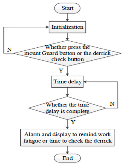 The regular inspection of the oil derrick and driller fatigue work reminders should be used in the time delay procedure. A driller mount guard button and an oil derrick check button are present. When the driller mount guard presses the mount guard button, the system starts to monitor the time to set off the alarm once the prescribed working hours are exceeded. Regular checks on the oil derrick are the same as those on the driller mount guard. The program flow chart is shown in Figure 12.
