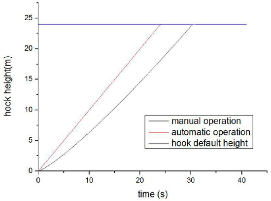 The traveling block hook monitoring system was successfully applied in a well site in Sichuan, China. The traveling block hook significantly reduced the labor intensity of the drilling workers. In the drilling work site, the automatic button launched the hook to rise to the present level automatically, the hook reached the preset height accurately, and then worked the trip. Manual and automatic operations were compared with the time change. The hook hike motion curve is shown in Figure 14.