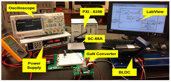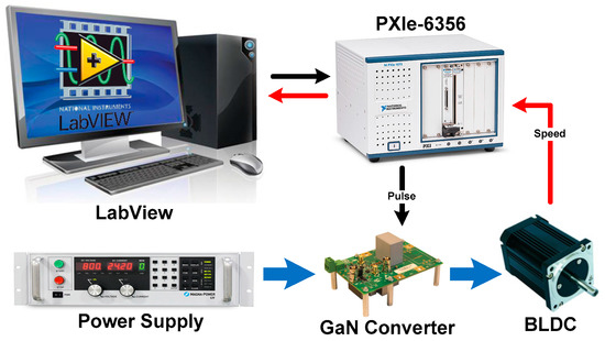 Figure 1 shows the system configuration used in this paper. A Hardware In the Loop (HIL) speed controller scheme by using GaN DC-DC converter and PXIe-6356 data acquisition device as an interface between LabVIEW processing unit and hardware setup is implemented.