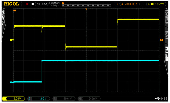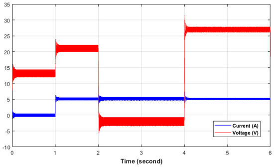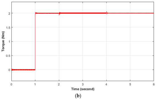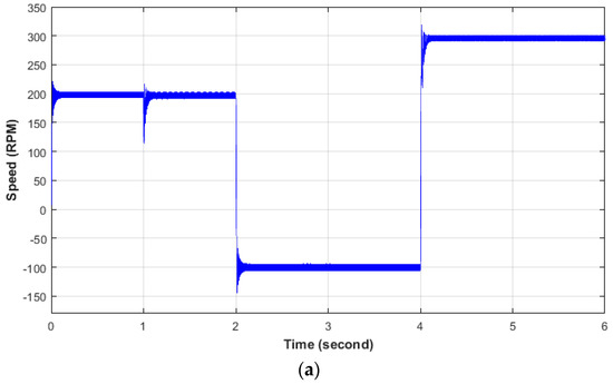 Figure 9 shows the experimental speed control capability of the proposed system along with the electrical torque of the BLDC motor in the lab setup. The reference speed is set to 200 rpm for t = 0 s to t = 2 s, −100 rpm for t = 2 s to t = 4 s, and 300 rpm for t = 4 s to t = 6 s, and the real speed and torque waveforms are monitored and saved by RIGOL DS4024E Digital Oscilloscope. As shown in