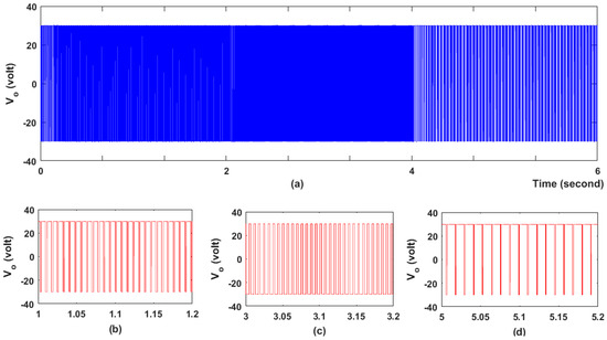 Figure 7 shows the GaN converter output voltage during simulation time that is including a series of high-speed pulses at 100 kHz switching frequency. A closer look at the pulse width shows that when the desired speed is higher, the pulse width in each switching period is larger, which helps BLDC to increase its speed.