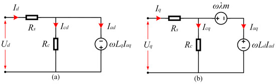 Figure 2. Steady-state equivalent d–q circuits of permanent magnet synchronous machine (PMSM) with iron loss resistance, listed as: (a) d-axis equivalent circuit; (b) q-axis equivalent circuit.