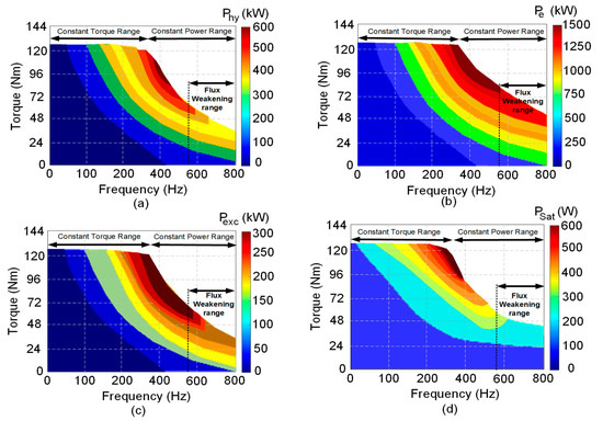 Figure 6. Predicted iron losses using modified IEM-Formula as function of torque and frequency, where: (a) the hysteresis loss; (b) the eddy-current loss; (c) excess loss contribution; and (d) saturation loss.