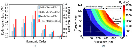 Figure 7. Harmonic spectra and total iron loss prediction using classic and modified IEM-Formula during flux weakening operation time (FWOT), where: (a) existing dominant harmonics on total iron loss and specially eddy current loss; (b) presentation of the torque-frequency-power loss by the modified IEM-Formula.