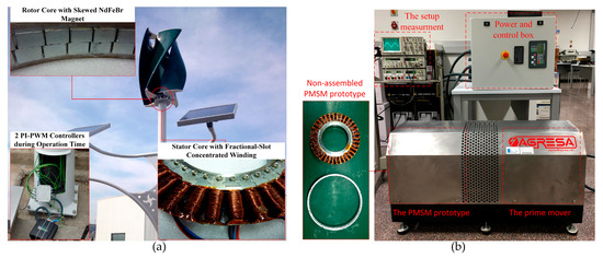 Figure 8a demonstrates the manufactured stator and rotor cores, and the two proportional integral-Pulse Width Modulation (PI-PWM) units as a part of the control system in a wind power application, in which a vertical-axis wind turbine is employed [31]. A test bench prototyping platform composed of a 6 kW synchronous wind generator with a 1024 points absolute encoder, current sensors and a power brake controlled load is also shown in Figure 8b.