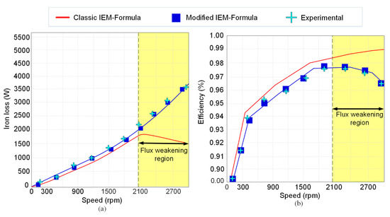 Figure 9. Comparison of classic IEM-Formula with modified IEM-Formula during FWOT, where: (a) shows total iron loss evaluation; and (b) presents efficiency computation.