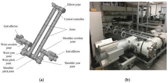 The simulated manipulator, shown in Figure 1, is designed according to an actual space manipulator. The manipulator contains seven sets of interchangeable revolute joints, two end effectors, two arms, and one central controller. They are distributed symmetrically. The manipulator has seven rotary DOF. When it operates, one end effector is fixed on the astrovehicle, and the other one can capture the target.