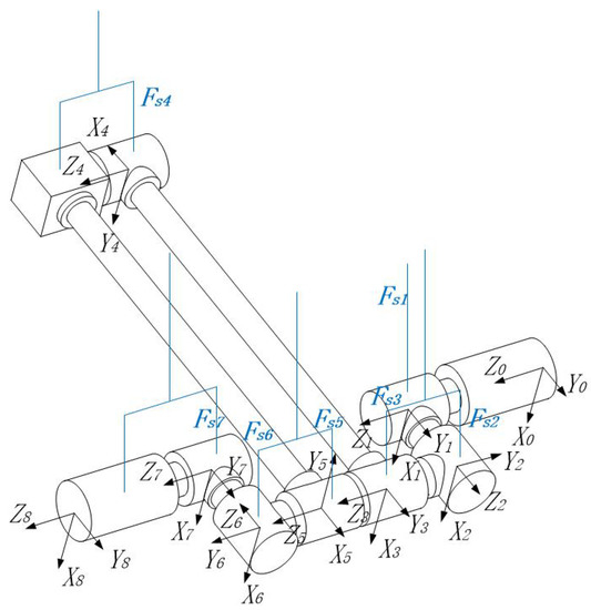 Assume the mass of link i is and the suspension force is . The suspension force and the gravity of link i are transformed into the link i coordinate system as follows: