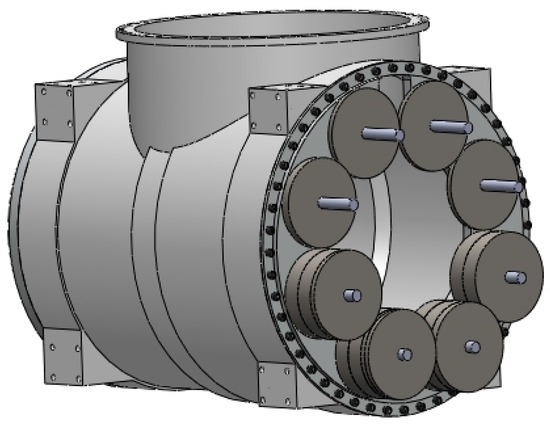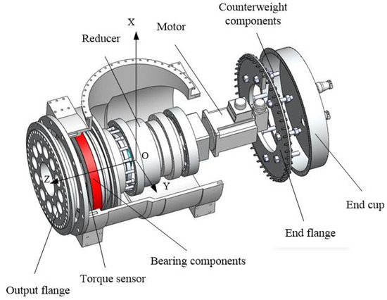 The joint of the simulated manipulator is shown in Figure 4. It consists of a box, a servo motor and its components, and counterweight components. The thickness of the box is 10 mm, and its maximum diameter is 345 mm. The servo motor and its components consist of a motor, a reducer, a torque sensor, and connectors, which can achieve the motion control and torque measurement of the joint. The counterweight components are used to adjust the barycenter of the joint.