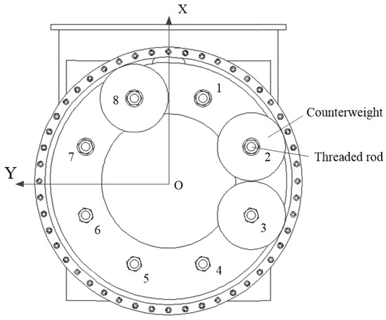 The counterweight components consist of threaded rods and several cylindrical counterweights, shown in Figure 5. The eight threaded rods are uniformly distributed in a circle, numbered sequentially from 1 to 8 in clockwise order. The masses of the cylindrical counterweights are certain, at values including 1, 0.5, and 0.3 kg. The counterweights will be installed in the corresponding rods, to adjust the mass and barycenter parameters satisfying the index.