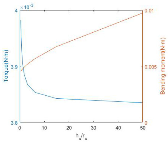 When the counterweight have a constant mass, the additional inertia torque of the joint, affected by the changes of the size parameters and , is shown in Figure 7. The larger is, the smaller the torque is. However, the bending moment of the joint will be huge as the growth of . The joint torque and bending moment, and the installation possibilities of the sizes need to be considered when we choose the parameters of the counterweight.