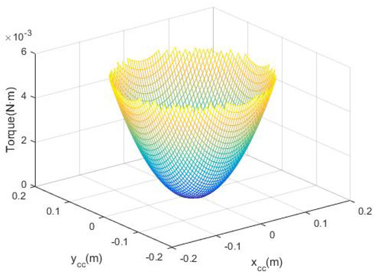 The additional inertia torque of the joint, affected by changes of the position parameters and , is shown in Figure 8. When the counterweight near the barycenter of the joint, the joint torque is small, but it is easy to cause interferences. The joint torque and the interference situation need to be considered when we choose the installation position of the counterweight.