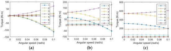 Torque of the simulated manipulator joints: (a) the suspension forces balance the gravity in magnitude and direction; (b) has a suspension force error of 2%; (c) has a suspension force error of 10%.