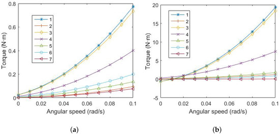 Assuming the original parameters m, m, kg/m, and , , , , we use the control variate method to determine the effects of the counterweight parameters on the joint torque. Assume that the angular acceleration of the joint is 0.1 , the seven joints are identical, and the compensation suspension system can completely balance gravity.