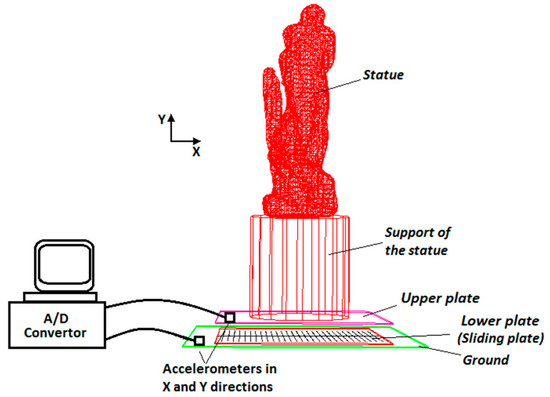 Vibrations of this structure and of the floor are continuously monitored in the new location. In fact, four accelerometers measuring in the horizontal and vertical directions are located inside the isolation system on the upper plate (i.e., the plate rigidly connected to the lower part of the support of the statue) and at the ground level. In Figure 1 the schematic figure of the monitoring system and the sensor positions are presented. Figure 2 shows the positions of the accelerometers on the isolation system. Two accelerometers are used to measure the vibration along the y (vertical) and x (horizontal) directions at the upper plate. In addition, ground vibration is measured by two accelerometers fixed along the same vertical and horizontal directions. Data are acquired continuously 24 h a day and stored every 10 min. In Table 1, the specifications for the sensors and the acquisition system are presented.