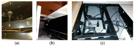 The positions of the accelerometers: (a) on the upper plate in the vertical direction; (b) on the upper plate in the horizontal direction; and (c) on the ground plate in both directions.