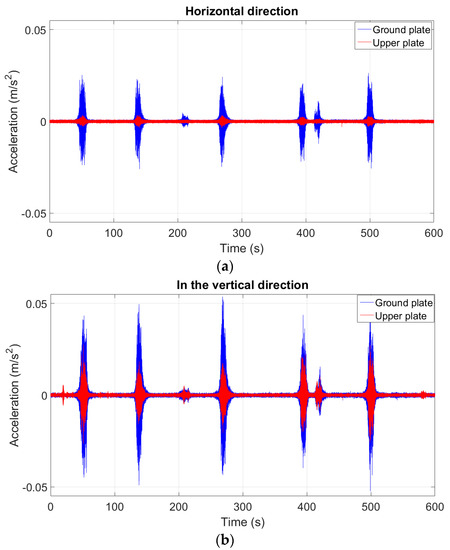 Measured time response for a specific time length on the seismic base and the upper plate in: (a) horizontal direction; (b) vertical direction.