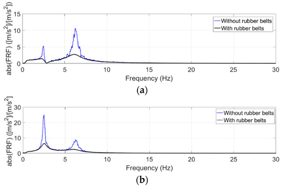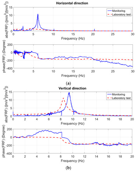 Frequency response functions (FRFs) between the measured points on the seismic plate and the upper plate: in (a) horizontal direction; (b) vertical direction.