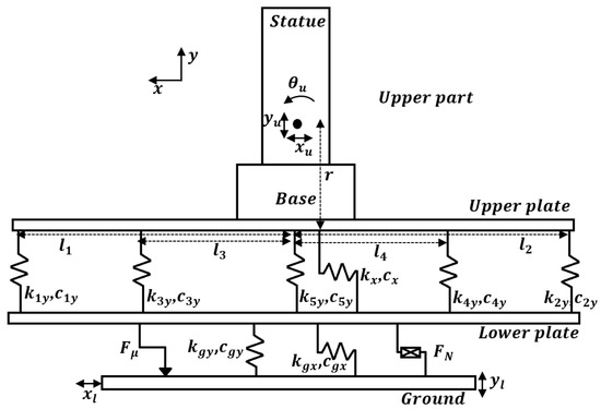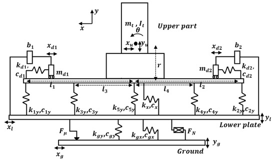 and where , and are mass, damping and stiffness matrices, respectively; and , and are the center of mass translation of the upper part along the x and y directions and the rotation of the upper part around the center of mass, respectively. In addition, and are the displacements of the lower plate in the x and y directions, respectively; is the disturbance transmitted from the ground to the lower plate; is the friction between the ground plate and lower plate; indicates the non-linear dissipating force. Details about the matrices and vectors can be found in [32,33]. The dissipative force is a non-linear function of the sliding speed between the lower and the ground plates, as depicted in the following form: