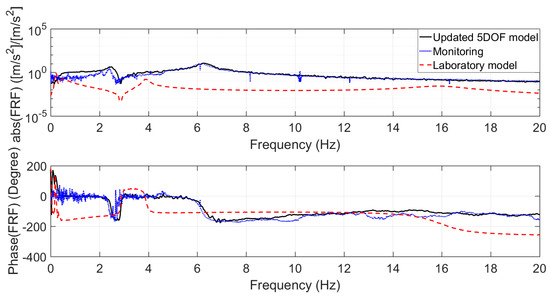 FRF in the vertical direction between the seismic plate and the upper plate obtained from the updated model (black line), and the corresponding FRF obtained from the monitoring (blue dotted line) and the older model (red dashed line).