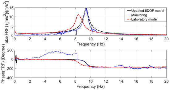 According to the measurements, the FRFs in the horizontal and vertical directions have been obtained by averaging complex values in the frequency domain. These FRFs are presented in Figure 4. The result in the vertical direction shows that the first natural frequency is about 9.4 Hz, which is relatively close to the results of the laboratory test. The FRF obtained for the horizontal direction is different from the results of the laboratory test. The results of the laboratory test have been plotted by red dashed lines in Figure 4. It should be noted the laboratory test has been carried out on a big shaker and by using a full-scale copy of the statue (for more information, please refer to Cigada et al. [35] and Siami et al. [36]). Therefore, we need to update our previous MDOF model considering the obtained results obtained from the monitoring system installed at the museum. The FRFs express a high level of vibration transmitted to the structure in the x-direction of about and, in the case of the vertical direction, 9.4 Hz.