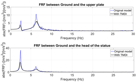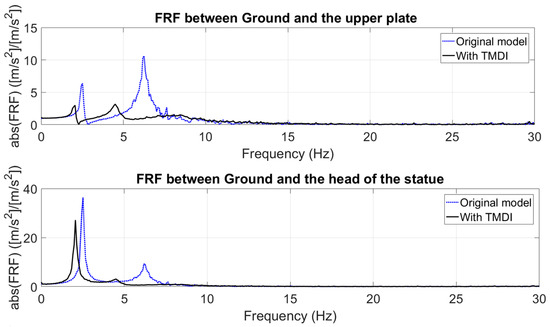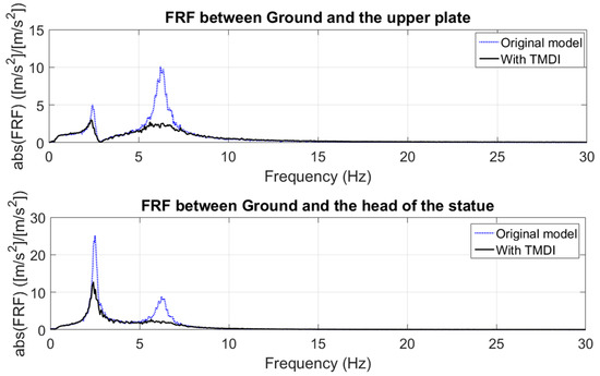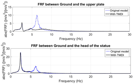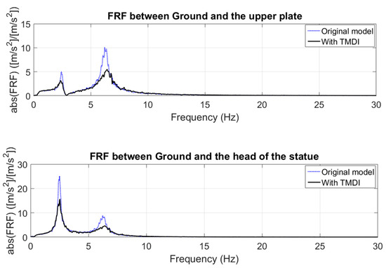 Considering the values given in Table 3, the FRFs between the ground plate and the upper plate and the head point have been plotted in Figure 12, Figure 13 and Figure 14. Based on these results, it becomes clear that tuning on the second peak (), provides significant reduction in this area, as expected (Figure 12). On the other hand, choosing a tuning frequency around the first peak (. ) can cause a proper reduction in the second peak and, simultaneously, we can see the positive effect around the first peak of the head point. It should be noted, in the case of an uncontrolled structure, that the vibration level around the first and lower resonance peaks for the statue head is clearly evident. Choosing a tuning frequency around the first peak () and using higher inertance and higher damping can cause significant reduction for both peaks.