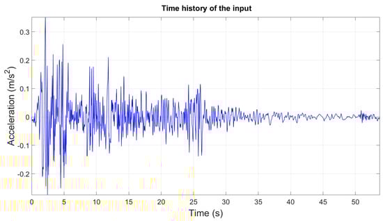 Here, the response of the model to the famous earthquake, North–South 1940 El Centro, has been evaluated. Figure 15 shows the time history of the earthquake in terms of measured acceleration. The response of the updated model to the disturbance for two cases according to Table 3 have been presented in Figure 16 and Figure 17. These figures illustrate the efficiency of the TMDIs in the presence of earthquake excitation. The FRFs have been presented between the ground plate and the upper plate and between the ground plate and the head point for each case (cases 1 and 2). In all cases, the amplitude level of the FRFs has decreased considerably.