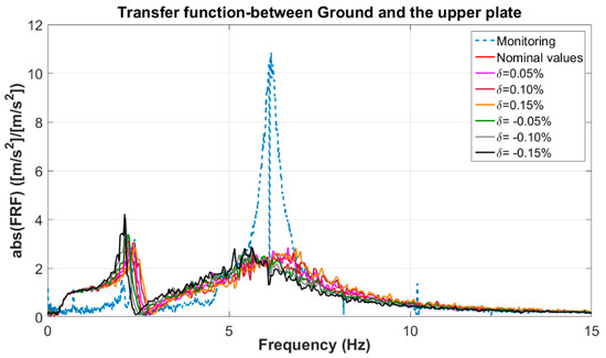 The other parameter that affects the results is the friction coefficient of the sliding unit. The FRFs for the updated model, thanks to the results from the monitoring and with a higher friction coefficient, have been plotted in Figure 9. It can be observed that the value calculated for the updated model () provides a higher level FRF for the upper plate.