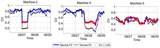 Examples of the metrics calculated within one time window: (a) two significantly different distributions yielding a CV of close to 0.2; (b) two distributions yielding a CV of around 0.5; (c) two very similar distributions yielding a CV of close to 1 [25]. Red curve shows the distribution of the selected machine and blue curve shows the distribution of its peers. Green line shows the selected area for calculating the CV.