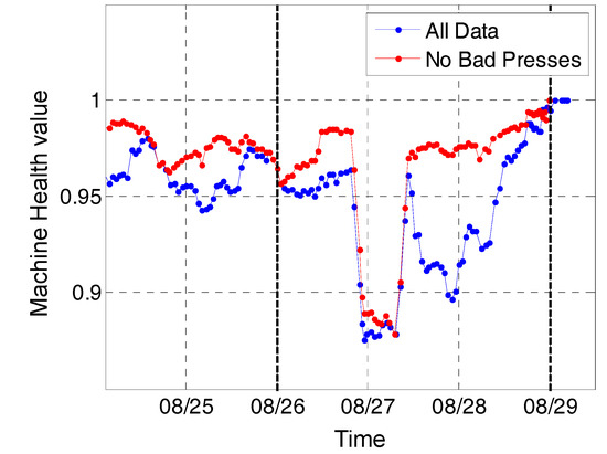 For evaluating the impact of removing the bad samples from the second stage, two metrics for the machine in the first stage were calculated: one using all the samples, and one using the remaining samples after filtering out the bad samples. Figure 4 shows both the metrics calculated for the machine in first stage. As it can be seen in this figure, removal of the samples causes the metric to bounce back to normal on 08/28, while the metric on 08/27 remained at the same level. Therefore, it is inferred that deviation observed on 08/27 is caused by the machine in the first stage, while the deviation on 08/28 is the result of performance of machines in the second stage.