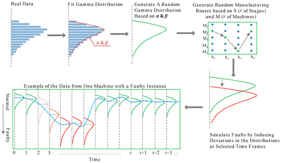 The Monte Carlo (MC) technique is a powerful tool for obtaining consistent simulation-based estimates and is comprehensively used in manufacturing applications to estimate the probability distributions for various parameters such as cutting force, tool life, product quality, etc. [26,27,28]. Monte Carlo is also used to draw a large number of samples within a distribution defined based on probability parameters [29]. In the case of simulating the data from a multistage manufacturing process, the real data—which was already available—was used to estimate the statistical parameters for data simulation, similar to how it was implemented in [30]. The procedure for simulating the data using the MC method is shown in Figure 5. A gamma distribution was fit to each of the quality variable of the data, and the shape and scale parameters of each variable were estimated. The MC simulation was programmed in MATLAB, and was developed to work for arbitrary number of machines and stages in a process. After simulating the samples for M machines and S stages, the data was time stamped and at some arbitrary instances, deviations were induced into one or more variables to simulate faulty machines. The fault instances were also randomly generated. While the total length of the simulated data was chosen to be 10 days, the fault instances lasted for two days each. The total number of faulty instances generated was dependent upon M and S, and was a number equal or close to . This number ensured sufficient number of faulty instances for evaluation purposes while avoiding too many faulty machines.