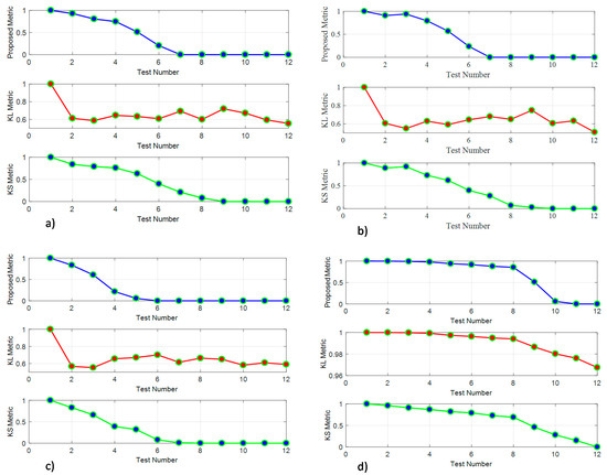 Figure 6 shows the results of the proposed metric, KL divergence and KS test statistic for the given pairs of distributions. As it can be observed from Figure 6, the proposed metric and the KS statistic both performed well in terms of early detection of the deviation and their consistency as the distributions diverge. However, the proposed metric had an advantage in terms of its consistency and its increased sensitivity compared to KS test as the divergence increases. This was observable by comparing the two metrics for test numbers 5 to 7 in Figure 6. The advantage of KL divergence method, however, was due to the fact that it shows the most sensitivity when the deviation is small. Considering that, KL divergence can be a robust method if an early alarm is desired for smallest deviations. While KL divergence had a good sensitivity in the early stages of deviation, it did not perform as consistently as the other two methods, and its values did not change consistently as the distributions diverge. The downside of implementing KL divergence is the possibility of high number of false alarms as it is very sensitive, and it fails to demonstrate the divergence trend in the data. When linearly shifting one of the distributions (Figure 6d), all the three metrics yielded similar results. Significant improvement in the performance of KL divergence metric can be observed in this case.