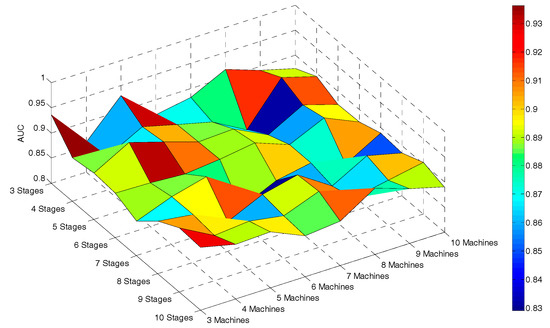 Using the simulated data, the developed similarity-based approach was evaluated in terms of the number of stages and machines within a process. For larger-scale manufacturing processes, the complexity of the process is higher and so it is more challenging to identify the root causes of variations. To evaluate the performance of the method for larger-scale manufacturing processes, the MC simulation was used to generate datasets from processes with number of stages ranging from three to 10 and number of machines ranging from three to 10, resulting in 64 datasets. Generating these sets of data facilitated the investigation of the effect of manufacturing scale on the accuracy of the method. For each dataset, the method was applied and the results were evaluated by calculating the AUC of the ROC curves. Figure 9 shows the AUC values for each of the 64 datasets. From Figure 9, it can be observed that this approach is robust for manufacturing processes with larger scales and high number of machines and stages. More importantly, the complexity and computational burden of the analysis is only increased linearly as the process scales up. In summary, it can be concluded that the proposed method is robust for different sizes of manufacturing processes and the accuracy does not get affected significantly for different numbers of machines and stages.