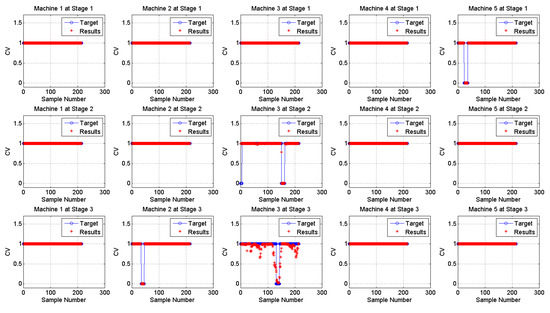 The results of the BN for monitoring and diagnosis of a multistage manufacturing process with three stages and five machines per stage.