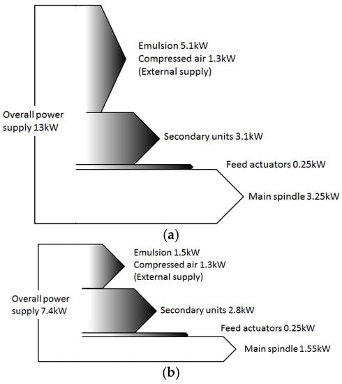 Breakdown of the average power supply needed for the production of a reference component: (a) roughing; (b) finishing. Gray shaded arrows represent energy consumption shares other than the main spindle of the machine.