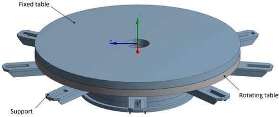 The transfers involved in the investigation consist of two tables (Figure 2), whose outer diameter is Dout = 1680 mm. The lower one spins around the y-axis, actuated by the torque motor; whereas the upper one is fixed to the frame and supports the three-axis units. In the following, they will be referred to as the “rotating table” and “fixed table,” Respectively. Supports are bolted under the rotating table in a number equal to the workstations. Each support carries a pneumatic vise that enables to safely grip the workpiece. The mechanical group described above is fixed to the ground at the base of the column.