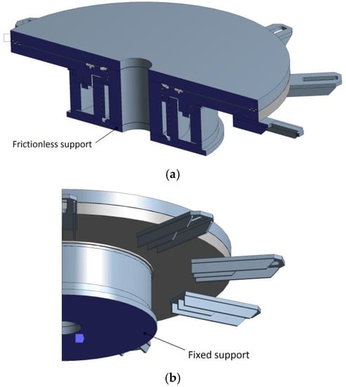 At first, the CAD geometry of the Transfer Machine with nine divisions has been simplified, in order to reduce the computational effort without significantly affecting the accuracy of the results: it must be remarked that the accurate evaluation of the stresses at notches or joints is beyond the scope of the present analysis. In fact, previous investigations carried out on similar machines showed that no significant stresses are generated on the key components of the frame during operation. Hence, the present analysis focuses just on the stiffness performance of the structure. Due to geometrical and loading symmetry conditions, a half of the geometry has been considered. A frictionless support has been applied on the symmetry plane, as shown in Figure 5a, in order to enforce the symmetry condition. Moreover, the base of the column has been constrained by means of a fixed support (Figure 5b): in the actual application, such a surface is constrained to the lower part of the frame, which can be considered perfectly rigid.