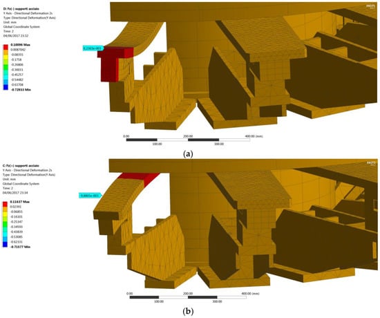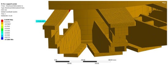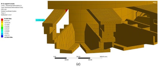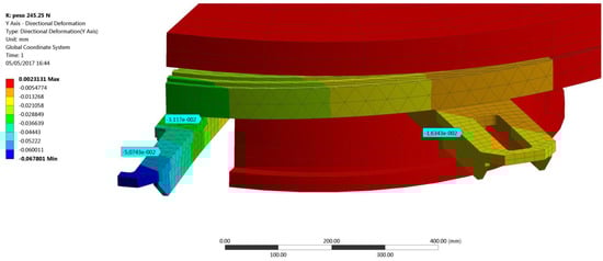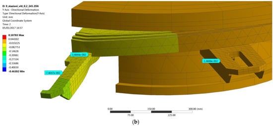 Figure 18 shows the displacements along the y-axis due to the sole bolt preload, whereas Figure 19 displays the values of y-axis displacement for the three load scenarios. The flagged spot always represents the projection of the center of gravity of the clamped lock on the support: the displacements measured at this point in the three different load cases are summarized in Table 5, along with the calculation of the displacements caused by the sole external loads (the displacement due to the bolt preload has been ruled out by applying Equation (2)).