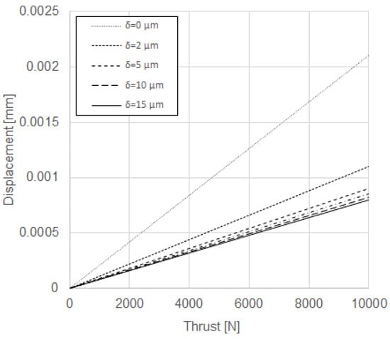 The results reveal that the numerical model, defined according to the basic settings reported above, is stiffer than the actual machine: hence, it has been decided to improve the model, by tuning the key parameters that affect its stiffness. The rotating table is supported by a double-row angular contact roller bearing. In the previous analysis, the bearing has been modeled as a unique ring made of steel: this approximation leads to overestimating its stiffness. Therefore, it has been decided to model the bearing by means of a single ring made of an elastic, isotropic material, whose Young’s modulus has to be determined upfront by the following steps. First, (i) a FE analysis of the ring alone is prepared, by assuming its elastic modulus as a parameter and the ring is constrained, replicating the actual application and loaded by an axial thrust; (ii) the displacement of the force application surface is recorded; (iii) the experimental displacement provided by the bearing manufacturer is read-in. The manufacturer usually provides plots like that shown in Figure 8, where several curves express the axial displacement of the bearing as a function of the applied thrust load. Each curve is relevant to a value of the assembly preload δ of the bearing: for the present application, δ = 15 μm; (iv) the Young’s modulus of the ring is adjusted until the FE calculated displacement matches the experimental axial displacement for given axial thrust.