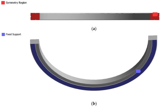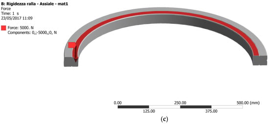The static structural analysis has been carried out on a half-ring geometry, as shown in Figure 9a: the ring has been constrained with a fixed support on its lower external surface Figure 9b; the upper inner surface of the ring has been loaded with a 10 kN load (Figure 9c).