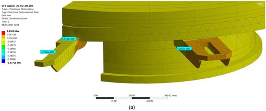 The contact at the interface between the support and the rotating table, as well as the one between the underhead of the screws and the support, has been set as frictional, with a friction coefficient μ = 0.2 [19]. The contact formulation has been set as pure penalty with a normal stiffness factor controlled by the software (FKN = 1). The terminal portion of the shank and the “threaded” hole on the rotating table have been joined by means of a bonded contact. The analysis has been divided into two steps: at the first step, a preload of Fi = 70 kN has been assigned to each screw: this preload is calculated, based on a tightening torque T = 106 Nm and oiled surfaces, μm = 0.10 [20,21,22,23], as for the company’s assembly specification. The displacements retrieved at this step are shown in Figure 12a. A vertical force F = 245.25 N has been added at the second step of the analysis with the bolt preload still acting (lock option set as active in the Ansys WB bolt preload tool). The difference between the displacements recorded at the end of the second step (Figure 12b) and at the end of the first step gives the displacements due to the effect of the external load only, as explained by Equation (2):