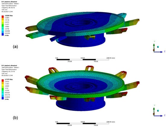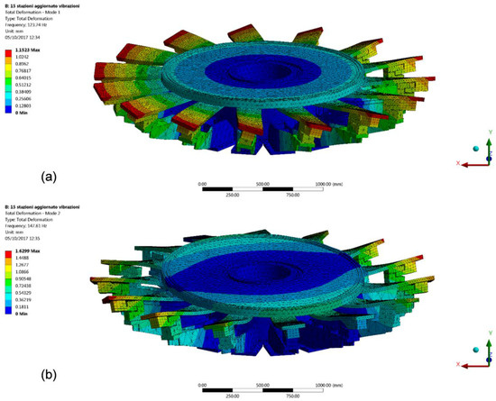 Based on the settings reported in the previous sections for the Transfer Machine with nine divisions, a modal analysis has been carried out in order to determine the first five modes of vibration of the same machine with 15 divisions. The natural frequencies are reported in Table 6 and the first two modes are shown in Figure 25a,b.
